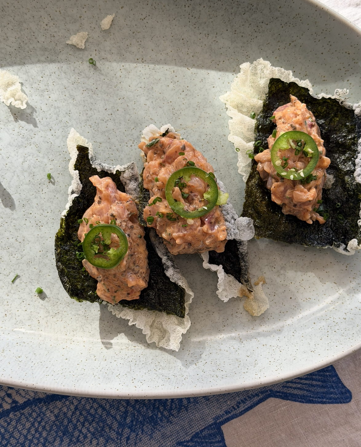 To serve, add roughly 30 grams of the tuna mix to each rice crisp. Garnish with chives and a slice of jalapeno (if using)